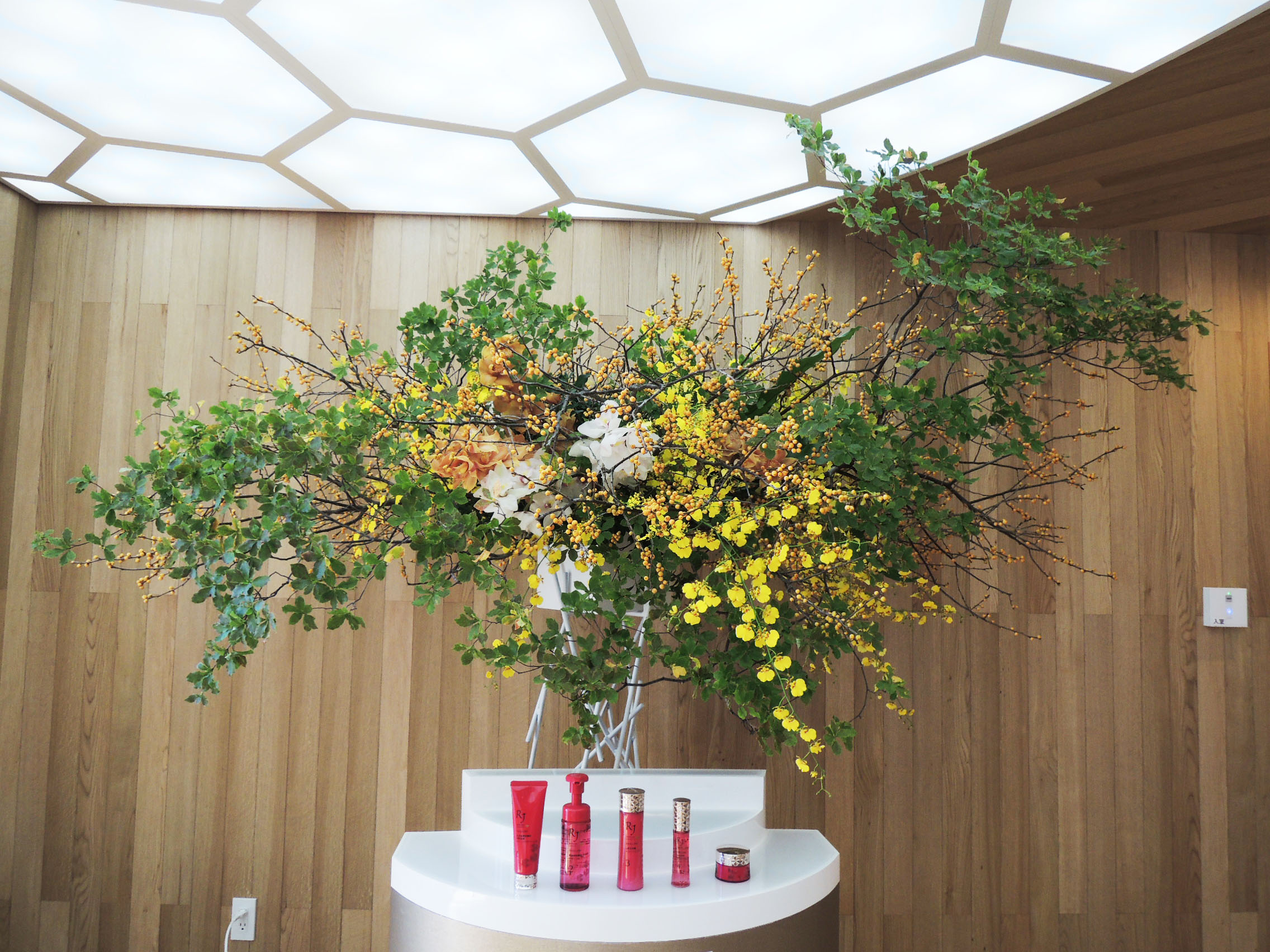 草月会館入口、イベント会場入口は「グリーン」をメインに。化粧品を包み込む演出のためどうだんつつじを使用して柔らかさとみずみずしさ、そしてハリを表現。