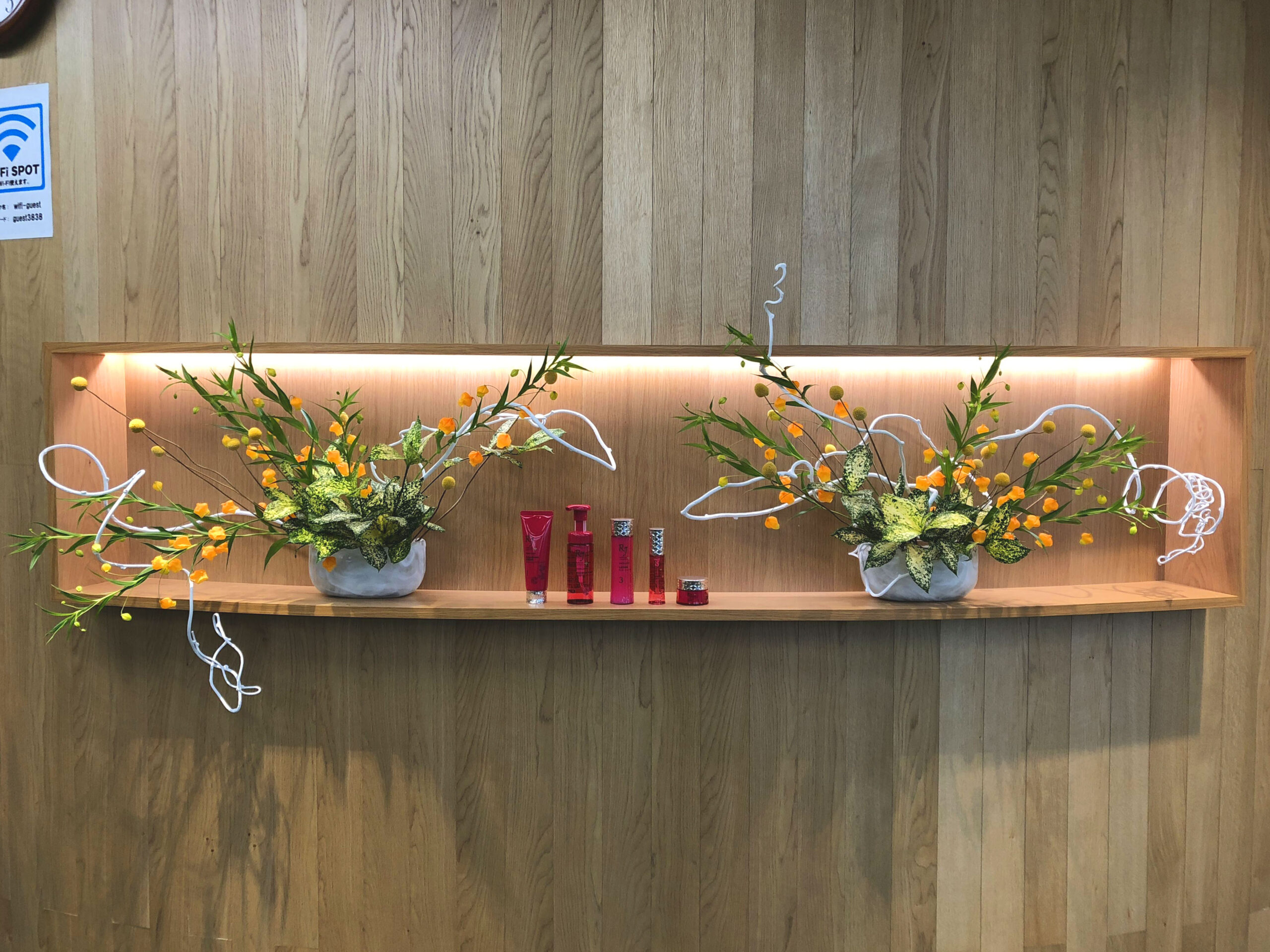 化粧品新シリーズお披露目会装飾のご依頼。爽やかさをコンセプトとして草月会館入口、イベント会場入口・内部の棚を装飾。