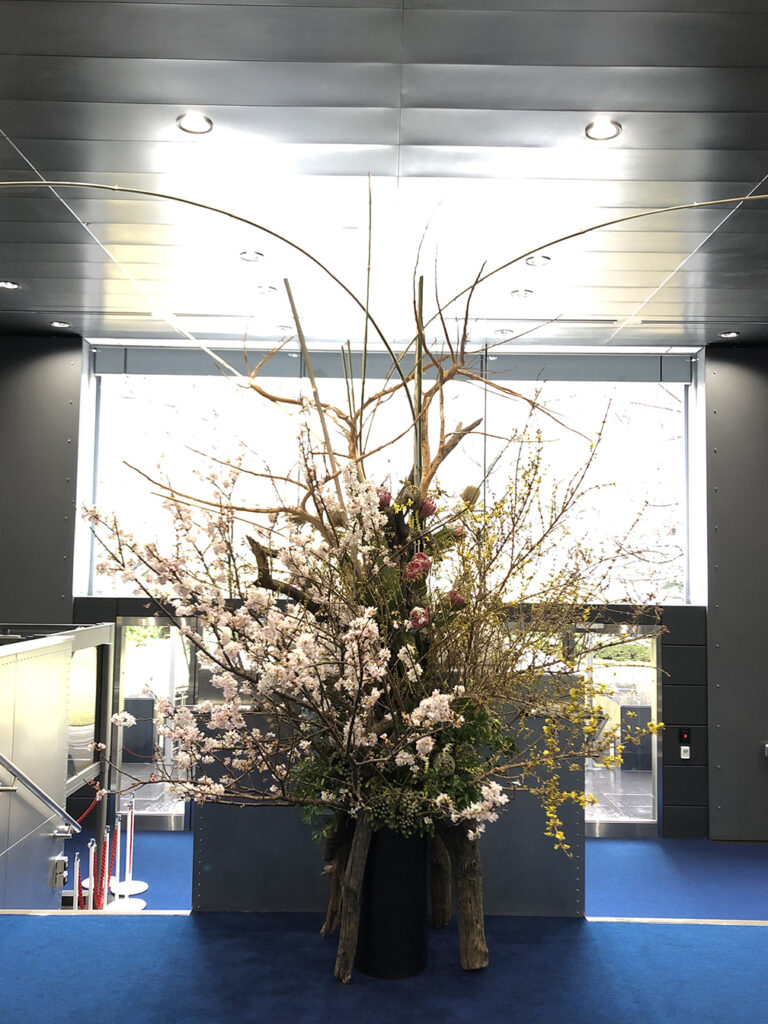 エントランスにはオーストラリア原産のユーカリやバンクシアを用いた竹作品、桜が満開の庭園には桜と調和する色合いの作品と、特色をいかした空間演出を行った。